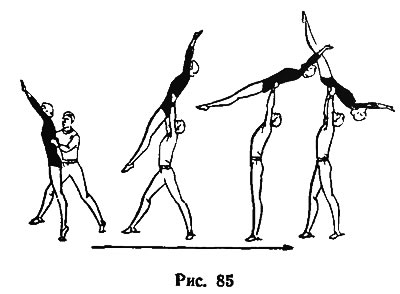 2. Рондат-фляк-отскок с вращательной компонентой (рис. 85). Основная задача — добиться «подхлеста» бедрами без выраженного сгибания тела. «Сваливание» плечами назад и прогибание тела — грубая ошибка! Упражнение выполняется со страховкой.