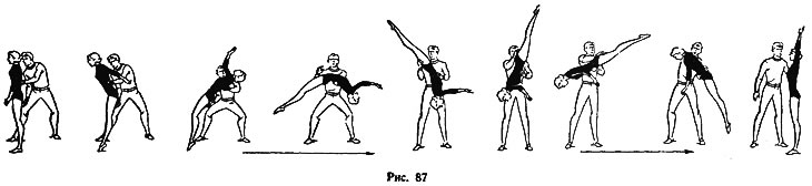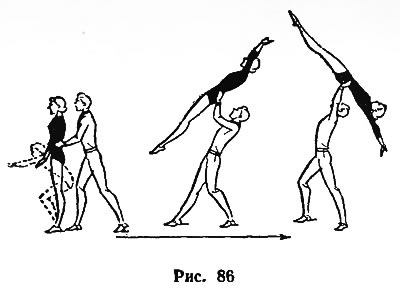3. Сальто прогнувшись с места. Основное внимание уделяется мощному, синхронному с отталкиванием маху руками (рис. 87).